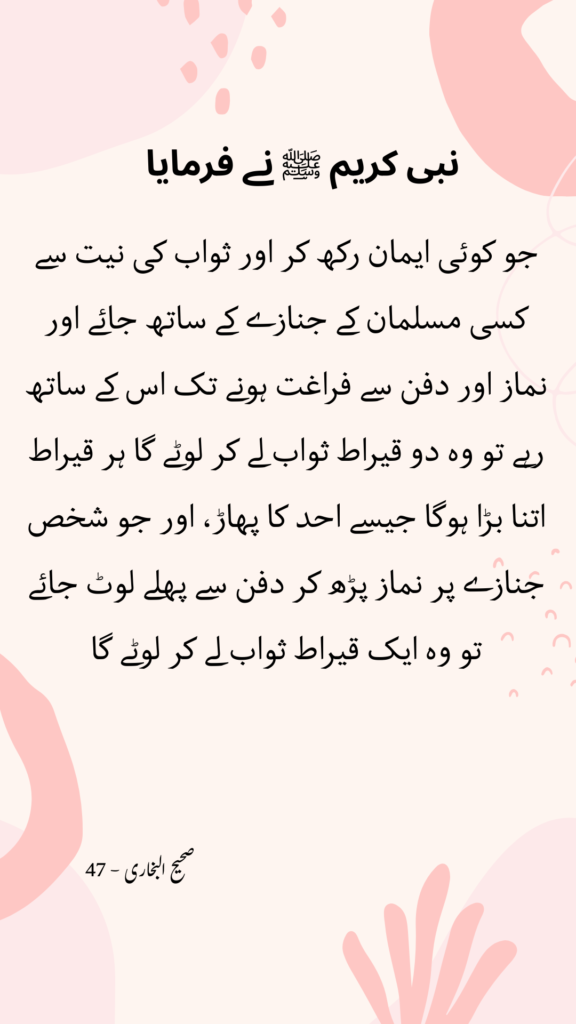 Bukhari – 47 – جو کوئی ایمان رکھ کر اور ثواب کی نیت سے کسی مسلمان کے جنازے کے ساتھ جائے اور نماز اور دفن سے فراغت ہونے تک اس کے ساتھ رہے تو وہ دو قیراط ثواب لے کر لوٹے گا ہر قیراط اتنا بڑا ہو گا جیسے احد کا پہاڑ