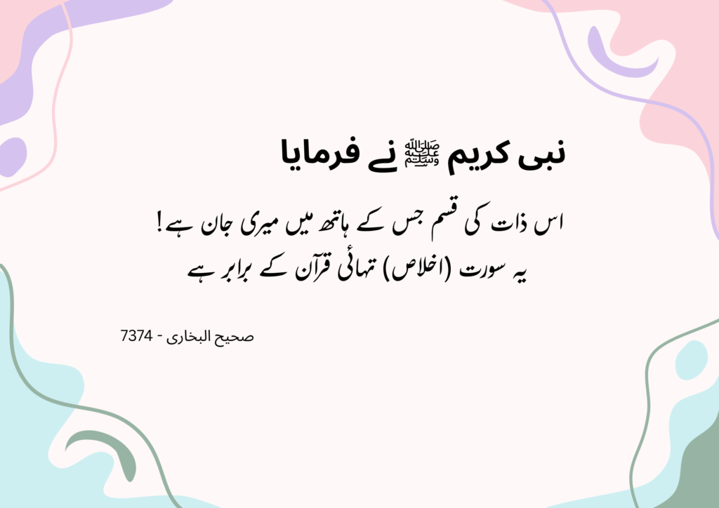 Bukhari-7374 یہ سورت (قل ھو اللہ احد) تہائی قرآن کے برابر ہے